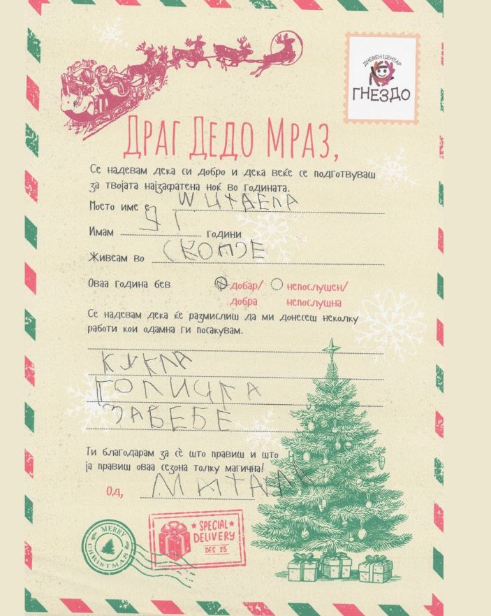 – Секое дете си напиша по три желби во писмото до Дедо Мраз. Толку скромни, толку човечки, толку детски. Ја водиме кампањата онлајн. Со надеж. Со верба. Со срце – велат од здружението „Новинари за човекови права“. Тие го покануваат секој што сака да усреќи некое од дечињата да избере едно писмо, да одбере подарок и да му го подари, причина повеќе, како што велат, тоа да верува во добрината.