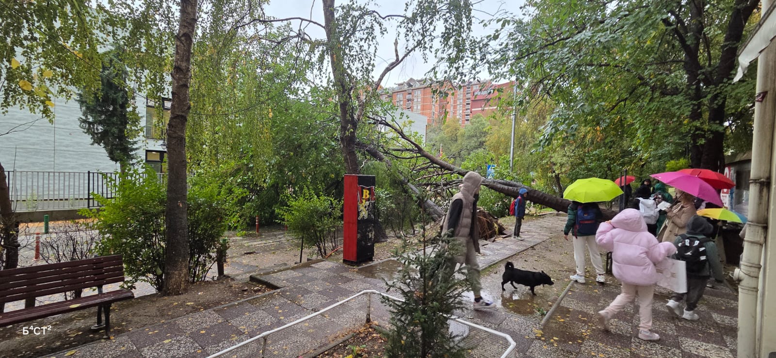 Oд Општина Центар соопштија дека екипите на ЈП „Паркинзи на Општина Центар“ и ЈП „Паркови и зеленило“ работат на остранување на двете паднати дрвја во близина на ООУ „Киро Глигоров“. Улицата е непроодна за возила додека не се отстранат дрвјата. Се очекува дрвјата да бидат отстранети за еден час.