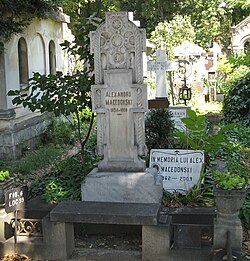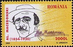 Како што пишува понатаму, романскиот поет, прозаист, драматург и публицист Александру Македонски (1854 – 1920) имал плодна и бурна активност во литературата и културата. Автор е на поетските книги: „Прв збор“ (1872), „Итало“ (поема, 1878) „Песни“ (1882), „Екселзиор“ (1895), „Бронзи“ (1897), „Светите цвеќиња“ (1912), „Поема на ронделите“ (1927), на прозните: „Тривијална драма“ (1896), „Златната книга“ (1902), „Искушенија на огнот“ (Париз, 1906), „Таласа“ (1916) – романската верзија на романот „Искушенија на огнот“, „Куси раскази“ (1923) и театарските: „Желба!“ (комедија, 1882), „Саул“ (со Синсинат Павелеску; трагедија, 1893), „Смртта на Данте Алигиери“ (1916) и „Близнаци“ (1918). Бил уредник на повеќе весници и списанија. Бил полемичар и активен учесник во многу настани и процеси во книжевниот, па и во општествениот живот на Романија. Често патувал и престојувал во западна Европа, а се обидел својата книжевна слава да ја достигне и во Франција. Поради полемичкиот дух и остриот јазик, некои го сметале и за ексцентрик, а конзервативните книжевни критичари го игнорирале додека тој бил жив. Но тој многу често изјавувал дека идните генерации ќе го оценат како голем поет. Статусот како еден од великаните на романската литература на Македонски му беше даден во последните децении на 20 век. Во 2006 година Александру Македонски постхумно бил избран за член на Романската академија.