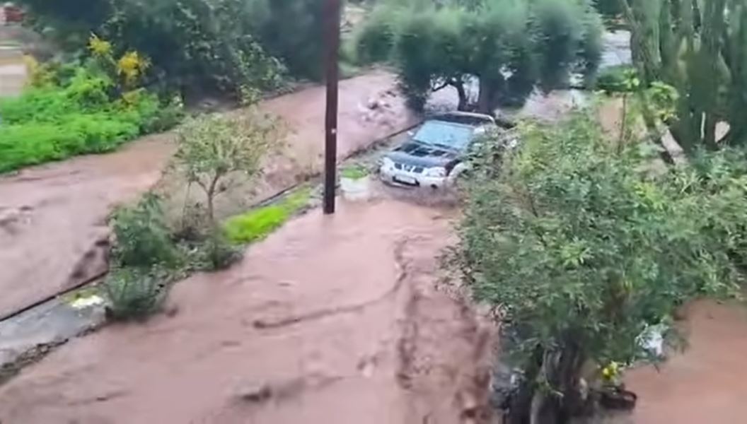 Во Гитео, особено во селото Платанос, ситуацијата стана алармантна откако беше испратена порака за итно предупредување. Големи количини вода навлегоа во домаќинствата, оштетија полиња, уништија автомобили и машини, а мртви животни може да се видат насекаде.