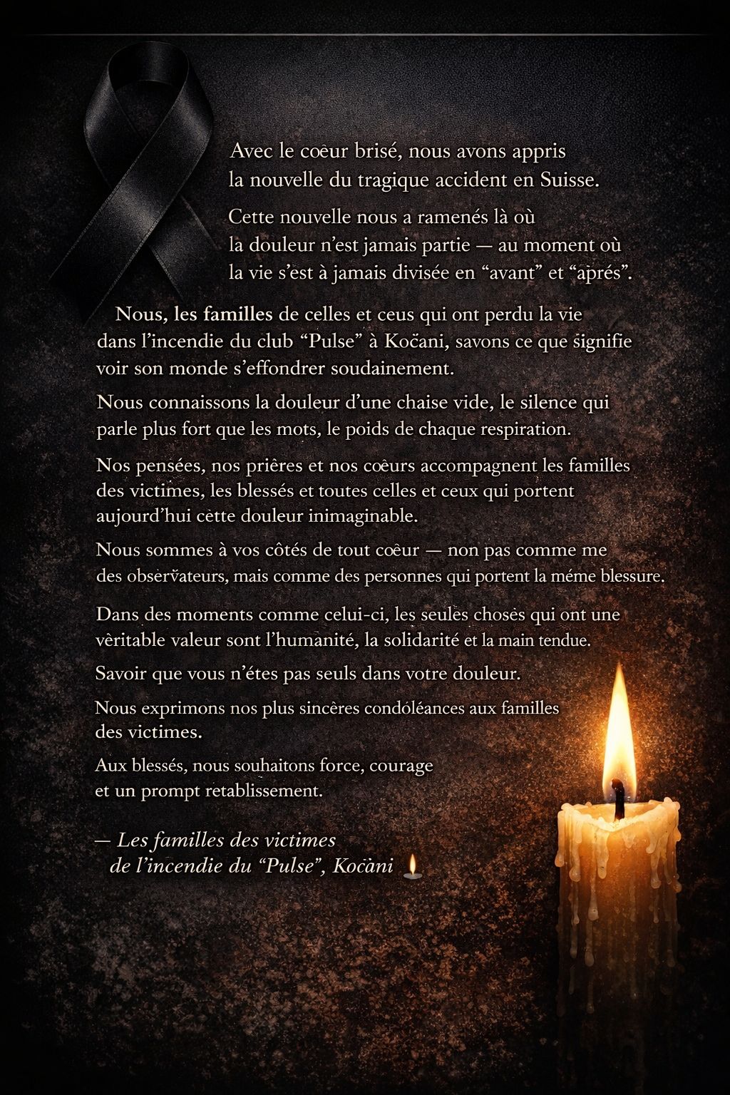 Додека Кран-Монтана тоне во тишина и жалост, а семејствата чекаат да ги идентификуваат телата на своите најблиски, кочанските мајки што ги изгубија своите деца во „Пулс“ испратија порака со силна поддршка и надеж за закрепнување. „Ние, семејствата на починатите во пожарот во „Пулс“ – Кочани, знаеме што значи ненадејно да ти се урне светот. Знаеме како боли кога ќе остане празно столче, кога тишината зборува погласно од зборовите, кога секој здив е тежок. Од срце сме со вас — не како набљудувачи, туку како луѓе кои ја носат истата рана. Во вакви моменти, единственото што има вистинска вредност е човечноста, солидарноста и подадената рака“, напишаа од Здружението „16 март 2025“. (П.А.)
