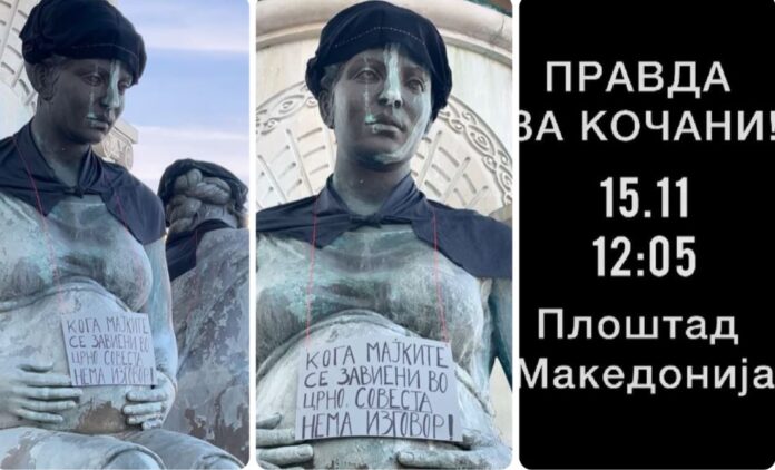 Движењето „Кој е Следен?“ денеска спроведе герила-акција на споменикот на Олимпија, кој го обви во црно за симболично да ја претстави црнината што мајките на децата во Кочани ја носат последниве 8 месеци.