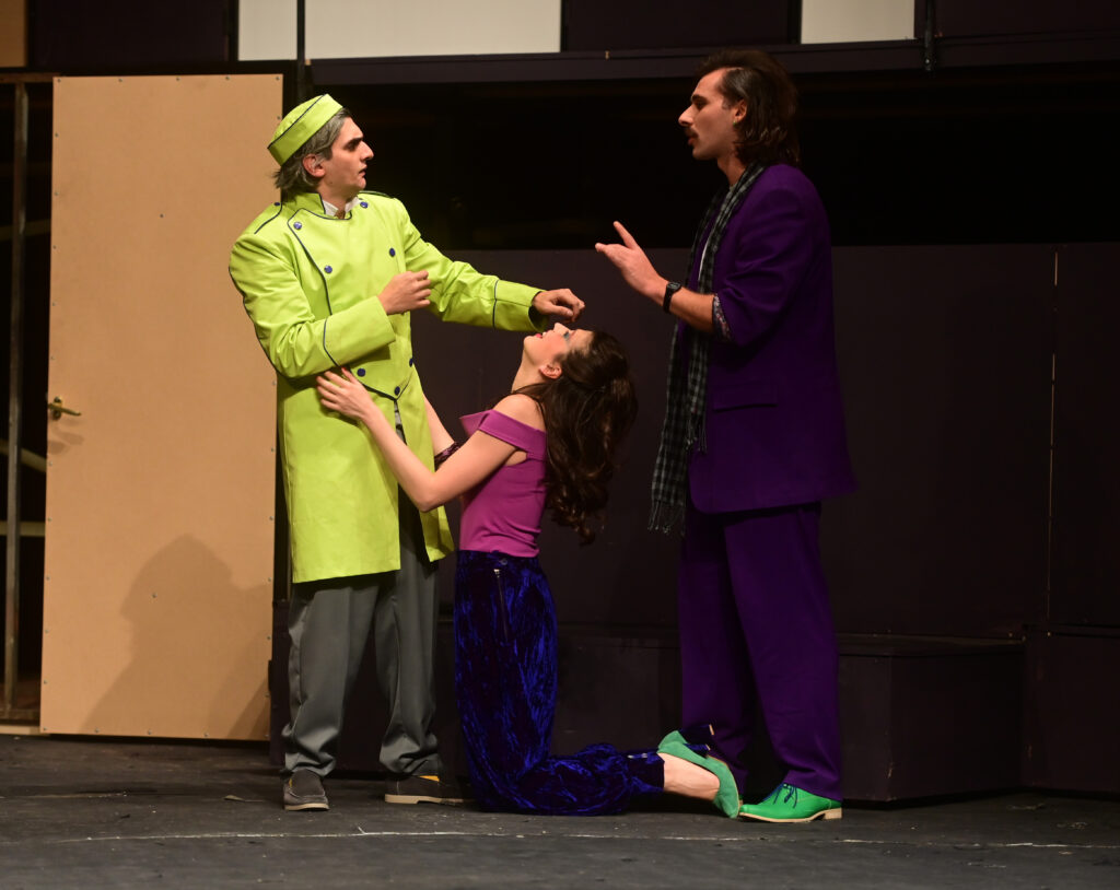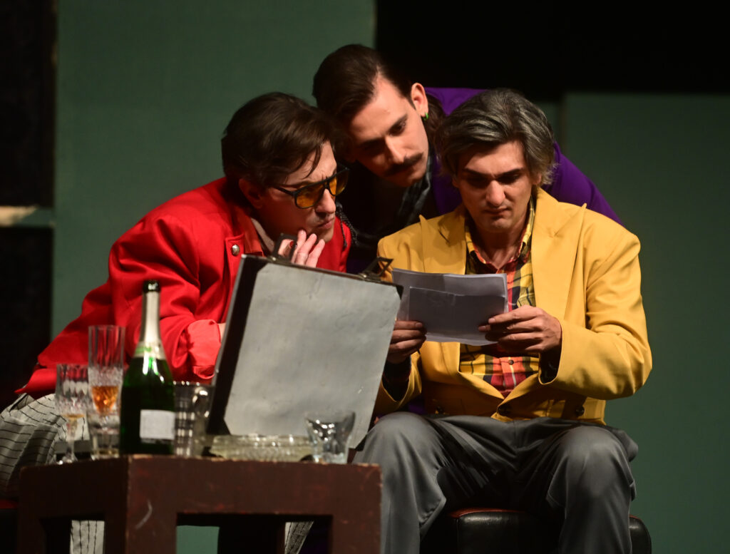 На сцената, и костимите на Раде Василев „бодат очи“. Дречливи зелени, жолти, портокалови, сини варијанти, со џиџи-миџи, со комбинации на бои што не одговараат, со перики и со обувки, тие наликуваат на облеката што доминираше во 80-тите години од минатиот век, но, како што рече претходно режисерот, и не мора неопходно да значи дека станува збор за конкретните 80-ти години. Сценографијата е на Мартин Манев.