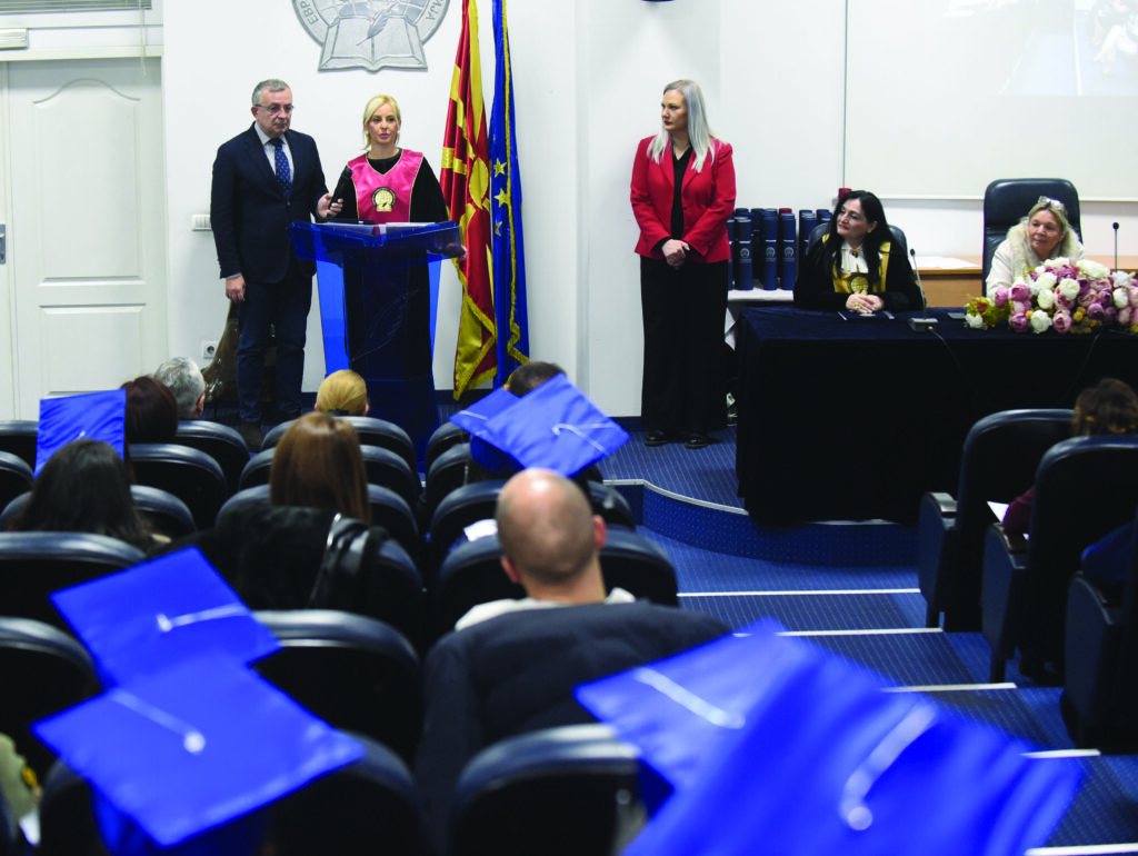 – Вашите дипломи се признание за вложениот труд, упорноста и посветеноста, но и обврска кон иднината. Вие излегувате од оваа институција како носители на знаење и вредности, и од вас се очекува повеќе од стручност – се очекува етика, критичко размислување, храброст и правичност. Стекнатите дипломи нека не ви бидат само формален документ туку морална обврска да дејствувате одговорно, професионално и чесно. Знаењето што го стекнавте треба да го употребите за вашиот личен напредок, придонес кон општеството, државата и пошироката заедница. Но, никогаш не заборавајте дека знаењето без одговорност е празно, а успехот без човечност е краткотраен. Секогаш имајте на ум дека вистинскиот успех се мери преку вашиот вложен труд. Вашиот професионален пат нека биде воден од интегритет, почит кон другите и свесност дека секоја ваша одлука има општествена тежина, порача проректорката проф. д-р Стамевска.