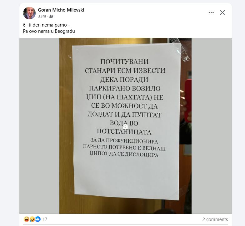 Еден граѓанин на стан во зграда во централното градско подрачје објави на социјалните мрежи известување до сите станари за причината поради која во објектот немаат греење.