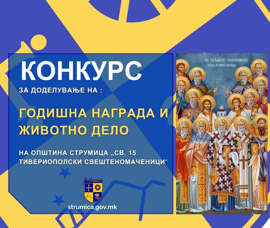 Комисијата за општествени дејности при Советот на Општина Струмица распиша конкурс за доделување на општинската награда „Свети петнаесет тивериополски свештеномаченици“, а по повод 11 Декември, Денот на заштитниците на градот.