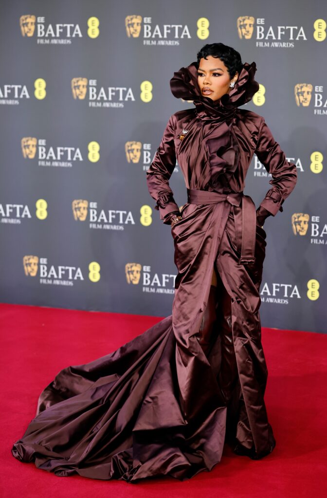 Една од највпечатливите појави на црвениот тепих беше актерката Тејана Тејлор, која носеше темноцрвен фустан од „Барбери“, елегантен, целосно затворен, кој преминуваше во висока и широка јака околу нејзините тил и уши.