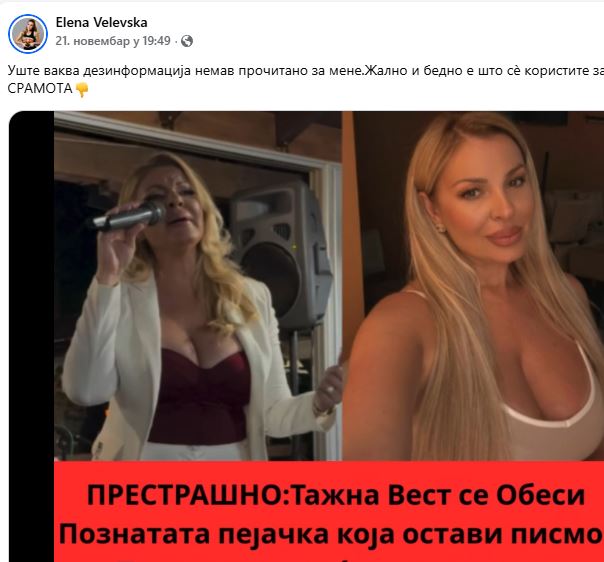 Станува збор за „самоубиството“ на популарната фолк-пејачка, Елена Велевска. Во лажната објава пишува дека Елена се обесила и дека оставила проштално писмо кое го адресирала до обожавателите и до нејзините во семејството. Сите беа избезумени! Па, отпосле разбраа дека е гнасна лага.