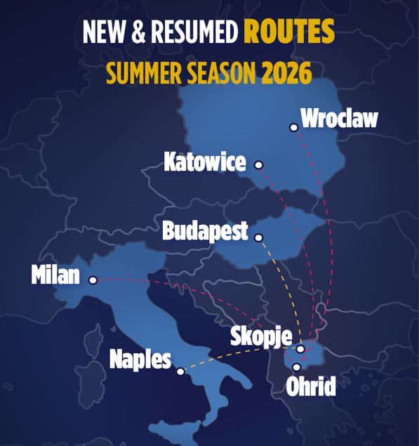 Пет нови авиолинии најавија вицепремиерот и министер за транспорт, Александар Николоски и извршнот директор на авиокомпанијата „Визер“, Јозеф Варади. Така, од охридскиот аеродром „Свети Апостол Павле“ ќе се лета кон полските градови Катовице и Вроцлав, како и до Милано и овие линииче станат опеаративни од 28 јуни 2026 година. Од скопскиот аеродром пак, „Визер“ од 6 април идната година ќе ги опслужува Наполи и Будимпешта.