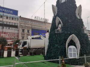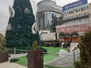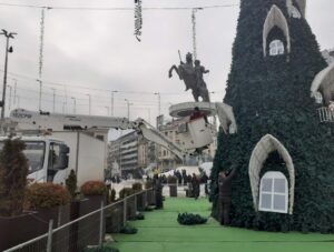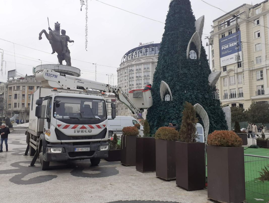 На плоштадот „ Македонија“ можеа да се забележат работници кои работат на отстранувањето на новогодишните украси, како и елката која, кога беше поставена предизвика низа коментари во јавноста.