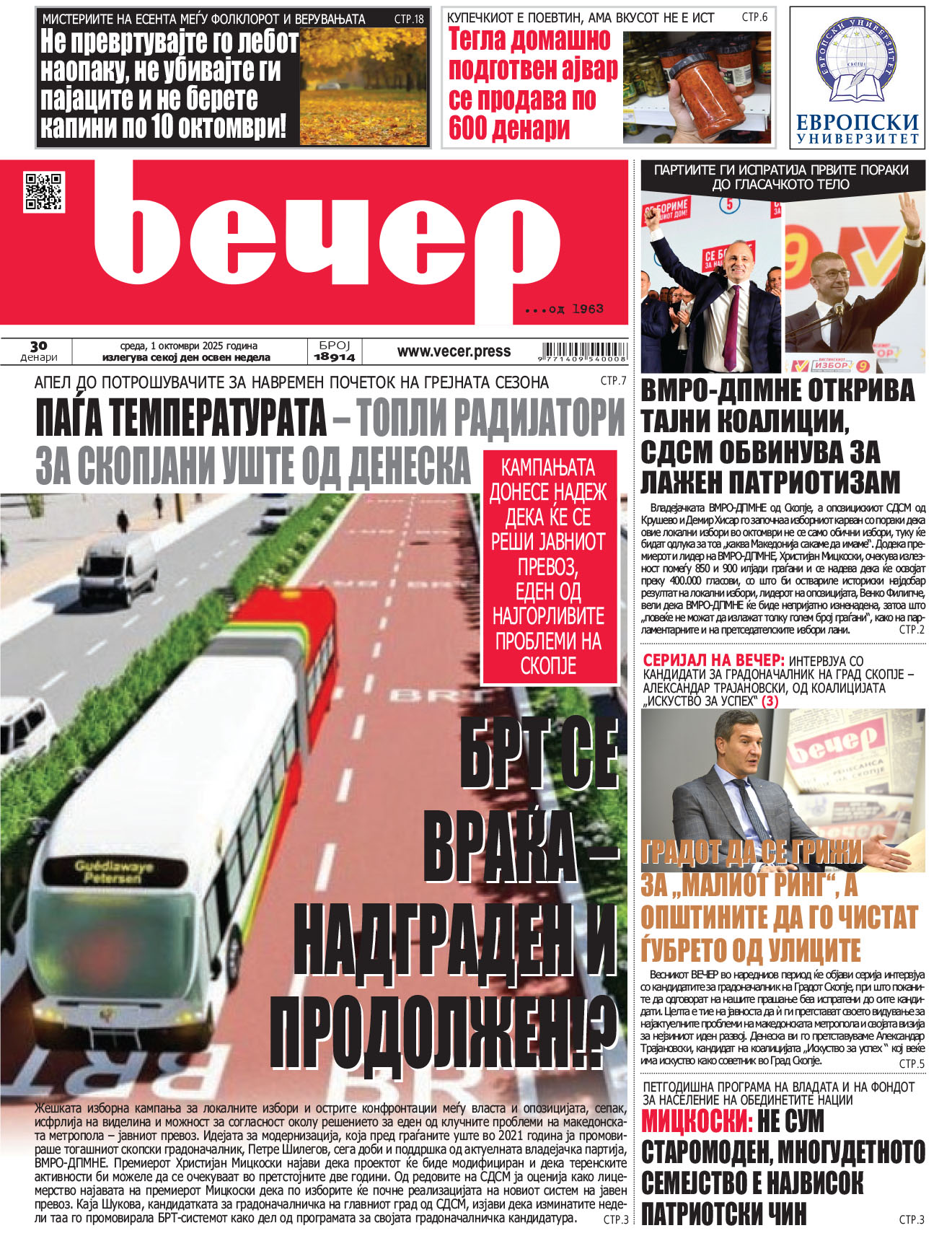 Сите содржини и објави на vecer.press се авторско право на редакцијата. Делумно или целосно преземање не е дозволено. Редакцијата на vecer.press не сноси никаква одговорност за коментарите и споделувањата на социјалните мрежи, бидејќи се генерираат преку Facebook, Twitter и други, и за нив важат правилата и условите на социјалната мрежа. Oбјавените содржини се авторска сопственост на vecer.press