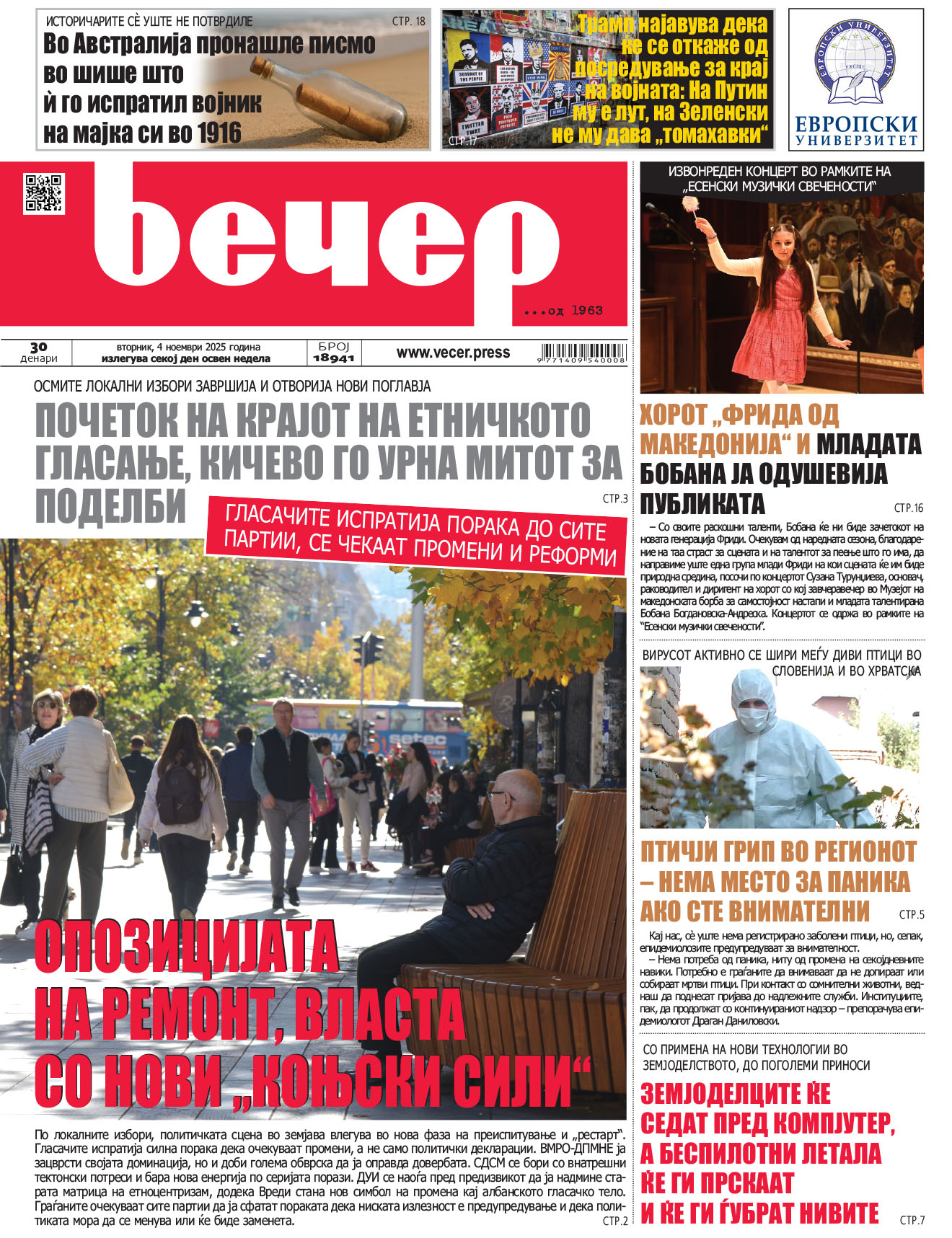 Број 18.941 Од страна на Вечер - 03/11/2025 16:35 58 FacebookTwitterPinterestWhatsAppLinkedinEmailTelegramViber ПРЕТХОДНИ 5Број 18.94002/11/2025 21:53Број 18.93931/10/2025 16:59Број 18.93830/10/2025 16:52Број 18.93729/10/2025 16:59Број 18.93628/10/2025 17:42