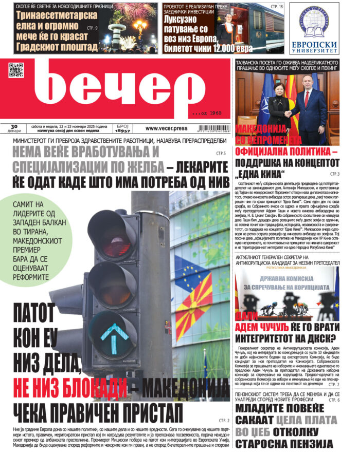 Сите содржини и објави на vecer.press се авторско право на редакцијата. Делумно или целосно преземање не е дозволено. Редакцијата на vecer.press не сноси никаква одговорност за коментарите и споделувањата на социјалните мрежи, бидејќи се генерираат преку Facebook, Twitter и други, и за нив важат правилата и условите на социјалната мрежа. Oбјавените содржини се авторска сопственост на vecer.press