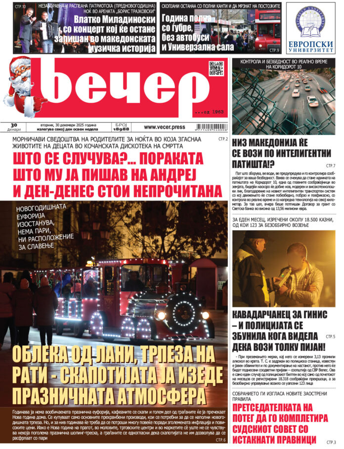 Број 18.988 Од страна на Вечер - 29/12/2025 16:45 16 FacebookTwitterPinterestWhatsAppLinkedinEmailTelegramViber ПРЕТХОДНИ 5Број 18.98728/12/2025 16:39Број 18.98626/12/2025 17:05Број 18.98525/12/2025 16:35Број 18.98424/12/2025 17:24Број 18.98323/12/2025 16:22