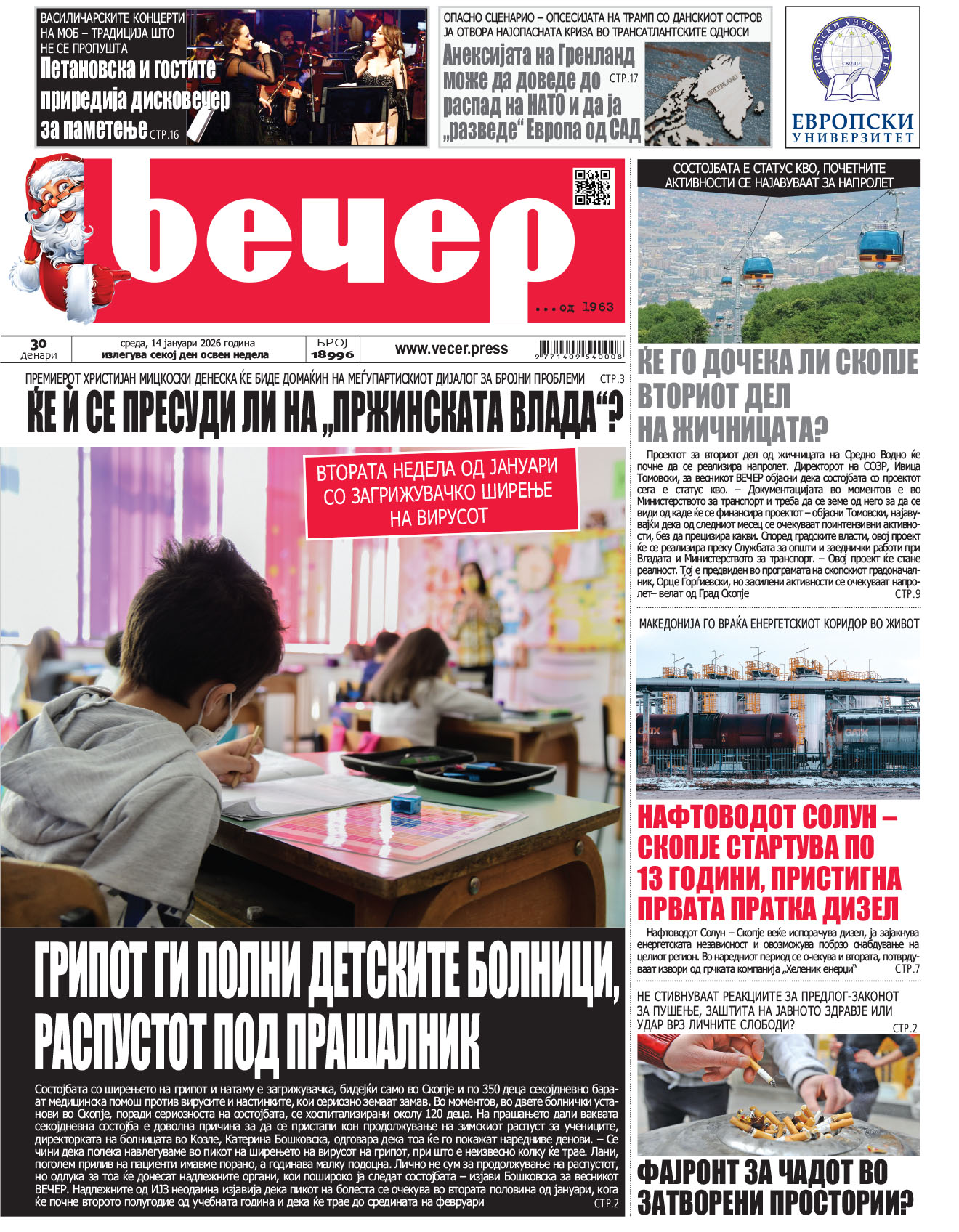 Број 18.996 Од страна на Вечер - 13/01/2026 16:34 23 FacebookTwitterPinterestWhatsAppLinkedinEmailTelegramViber ПРЕТХОДНИ 5Број 18.99512/01/2026 16:42Број 18.99411/01/2026 17:28Број 18.99309/01/2026 17:44Број 18.99208/01/2026 17:13Број 18.99104/01/2026 17:07