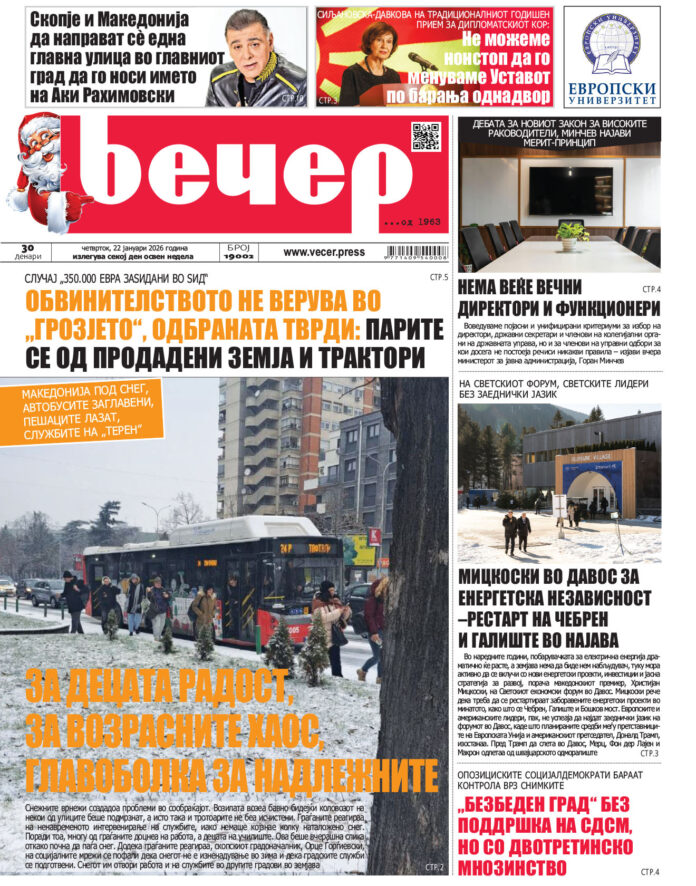 Број 19.002 Од страна на Вечер - 21/01/2026 17:13 12 FacebookTwitterPinterestWhatsAppLinkedinEmailTelegramViber ПРЕТХОДНИ 5Број 19.00120/01/2026 16:59Број 19.00019/01/2026 16:20Број 18.99916/01/2026 17:02Број 18.99815/01/2026 16:39Број 18.99714/01/2026 18:46