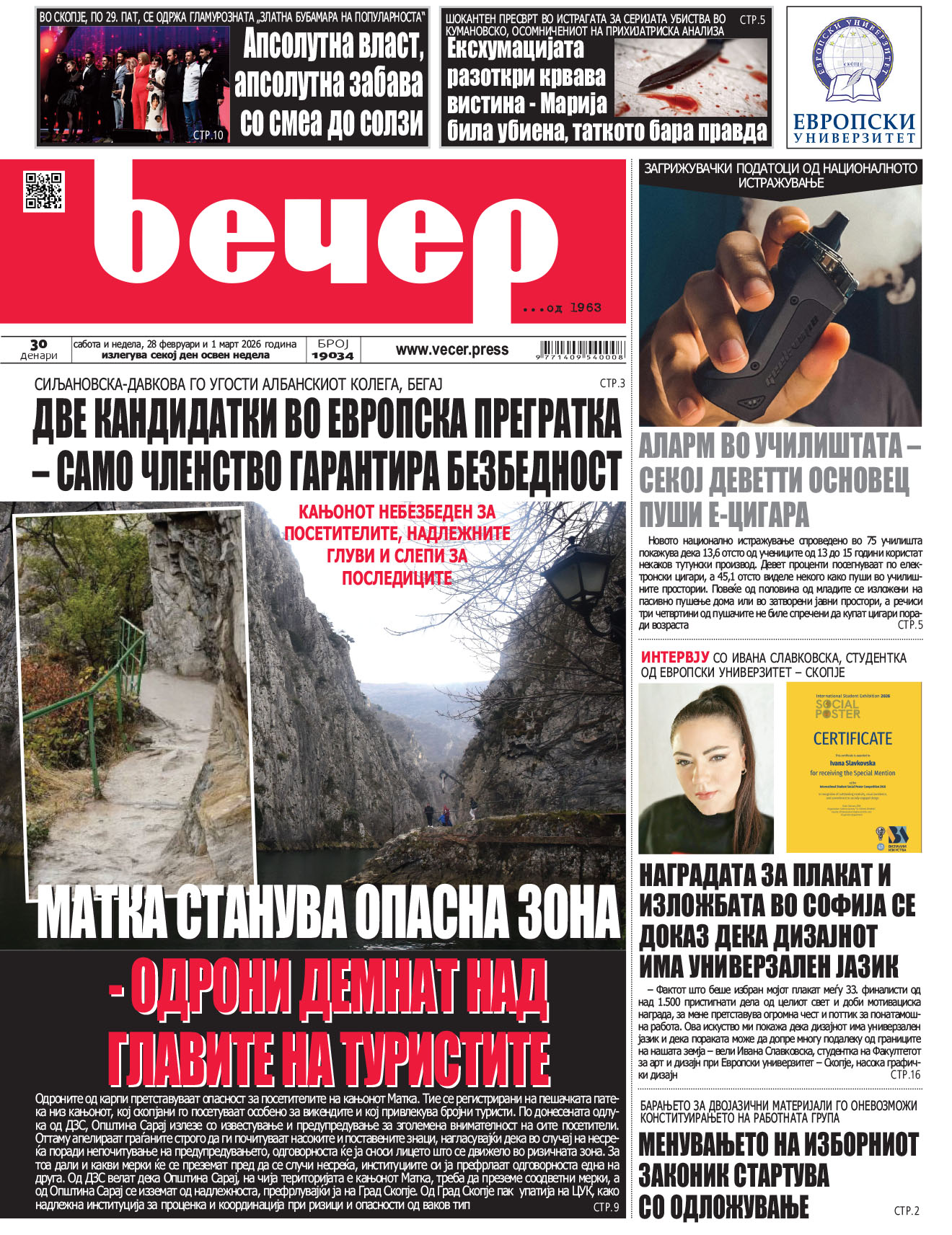 Број 19.034 Од страна на Вечер - 27/02/2026 16:55 13 FacebookTwitterPinterestWhatsAppLinkedinEmailTelegramViber ПРЕТХОДНИ 5Број 19.03326/02/2026 16:46Број 19.03225/02/2026 16:51Број 19.03124/02/2026 17:31Број 19.03023/02/2026 16:55Број 19.02922/02/2026 16:31