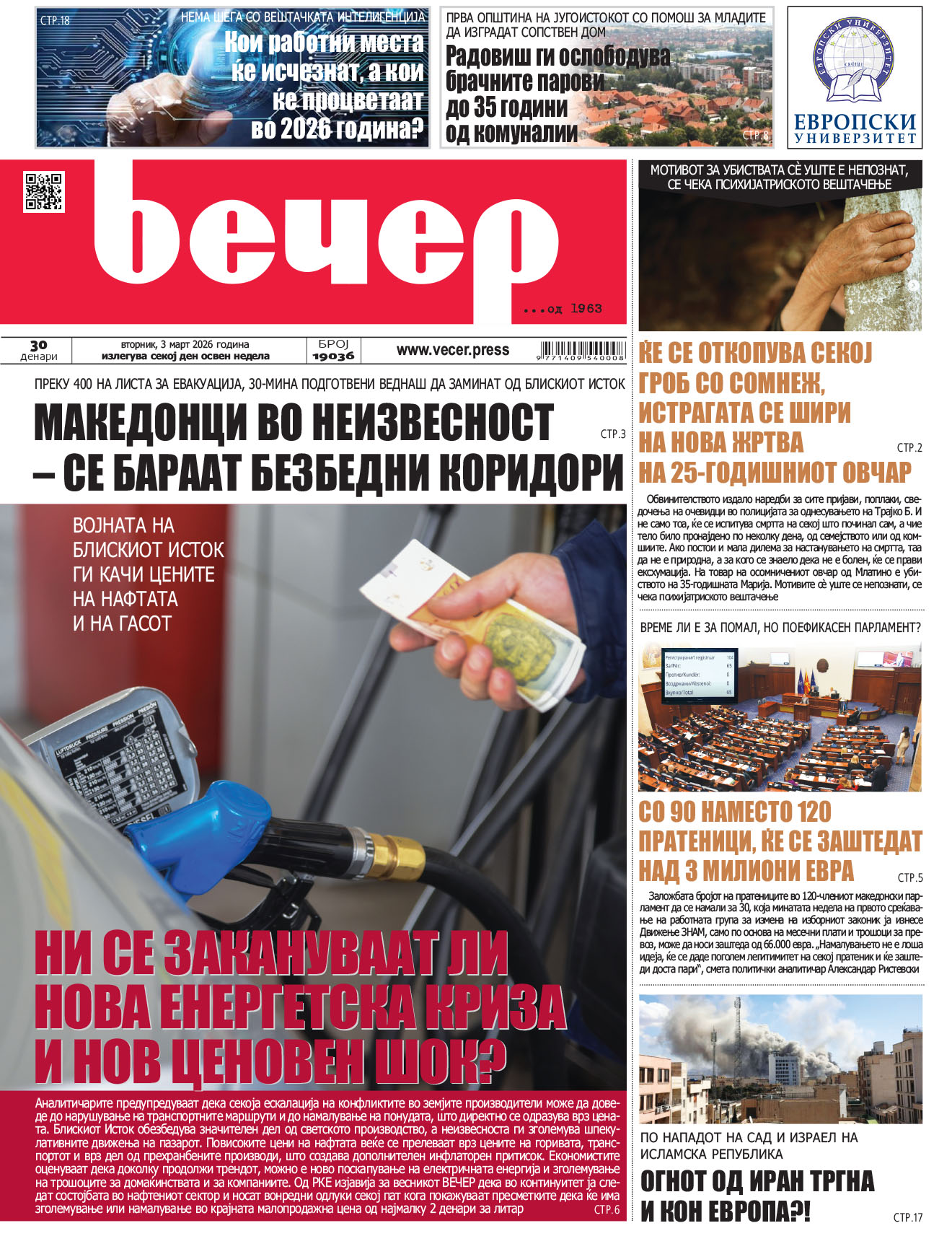 Број 19.036 Од страна на Вечер - 02/03/2026 16:55 10 FacebookTwitterPinterestWhatsAppLinkedinEmailTelegramViber ПРЕТХОДНИ 5Број 19.03501/03/2026 17:07Број 19.03427/02/2026 16:55Број 19.03326/02/2026 16:46Број 19.03225/02/2026 16:51Број 19.03124/02/2026 17:31