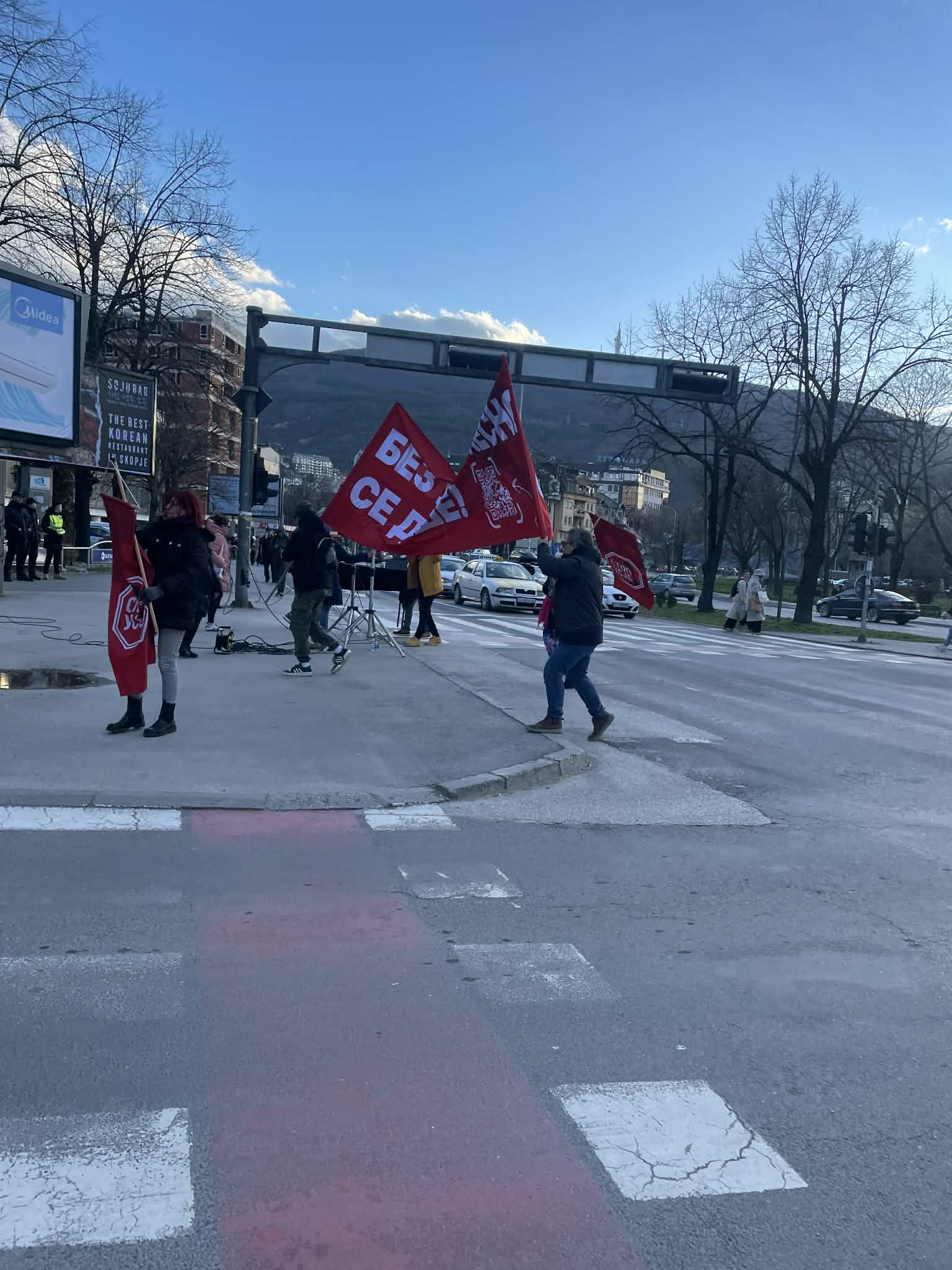 На раскрсницата кај „Нова Македонија“ попладнево се случи герила акција на која учесниците прошетааа со транспаренти со натписи „Без Усје полесно се дише“.