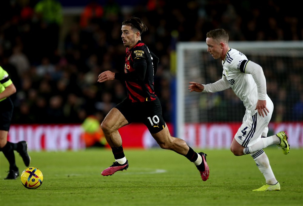 epa10380573 Adam Forsha (R) of Leeds in action against Jack Grealish (L) of Manchester City during the English Premier League soccer match between Leeds United and Manchester City in Leeds, Britain, 28 December 2022. EPA-EFE/Adam Vaughan EDITORIAL USE ONLY. No use with unauthorized audio, video, data, fixture lists, club/league logos or 'live' services. Online in-match use limited to 120 images, no video emulation. No use in betting, games or single club/league/player publications