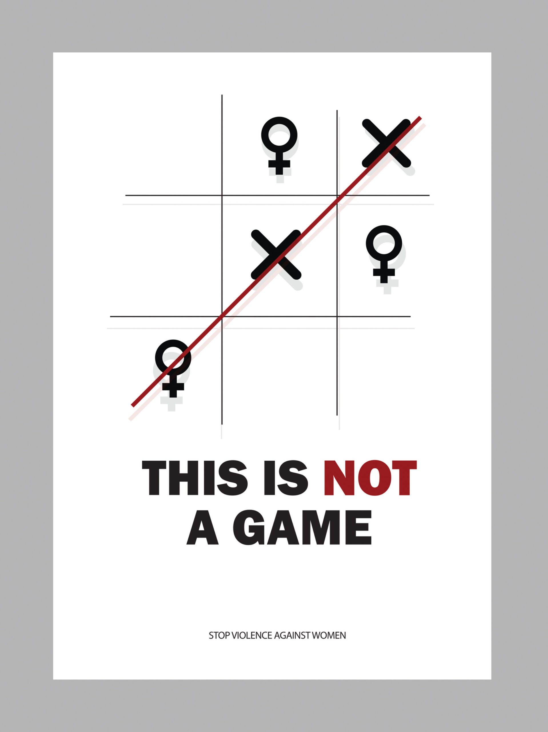 Плакатот е насловен „Ова не е игра“ и се однесува на насилството врз жените, а е решен преку симболиката на играта икс-окс. Наместо играчи, се појавуваат женските симболи и со црвена дијагонална линија ја прекинувам „играта“, со што се потенцира дека ова не е нешто што смее да се третира како забава, статистика или како секојдневие. Минималистичкиот пристап и редуцираниот колорит се во функција на пораката: со малку елементи да се постигнат силна визуелна реакција и јасен став.