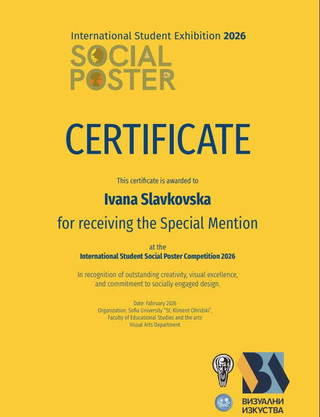 Конкурсот за социјален плакат во Софија и изложбата во галеријата „Алма матер“ ми беа предложени од мојата професорка, проф. д-р Гордана Вренцоска, во рамките на предметот Графички дизајн 1, каде што работевме на темата „Реални светови“. Тоа воедно беше и мое прво учество на меѓународен конкурс. Фактот што беше избран мојот плакат меѓу 33. финалисти од над 1.500 пристигнати дела од целиот свет и доби мотивациска награда, за мене претставува огромна чест и поттик за понатамошна работа. Ова искуство ми покажа дека дизајнот има универзален јазик и дека пораката може да допре многу подалеку од границите на нашата земја.