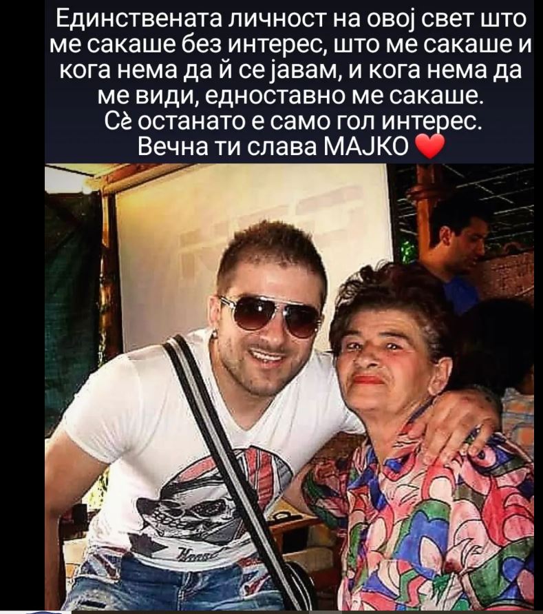 – Мајка ми почина во 2017 година. Често доаѓаше кај мене во Скопје. Кога ѝ се слоши таа ноќ, се погоди да биде во Штип, со брат ми. Ми се јави, дека многу ѝ се качил шеќерот и дека ја однеле во болница. Не можеле да ја спасат. Почина на пристојни години, на 63, ама тоа не се некои години, можеше уште да живее, да им се радува на снаата, на внучето, на секој нов ден…. Не ја дочека ниту мојата свадба, на која, поради големиот притисок од емоции, не можев да се воздржам, па заплакав. Пеев една тажна песна. Поради силната тага за мајка ми. Да беше жива, многу ќе му се радуваше на својот син, кој стана семеен човек.