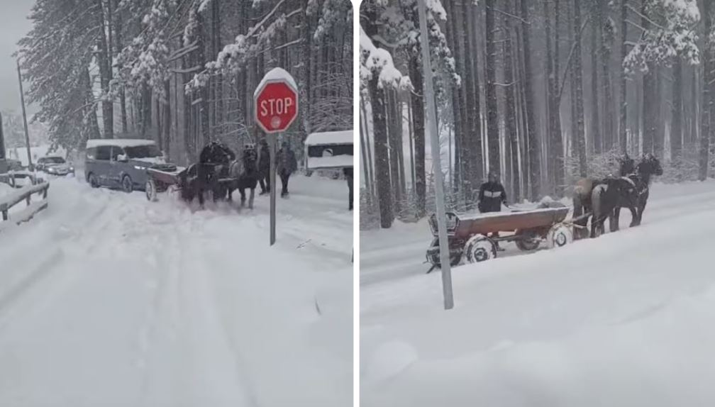 Необична глетка беше забележана и на завеаната планина кога комбе се заглави во снегот. Кола со два коња дојде на помош и прва го извлече возилото од снегот.