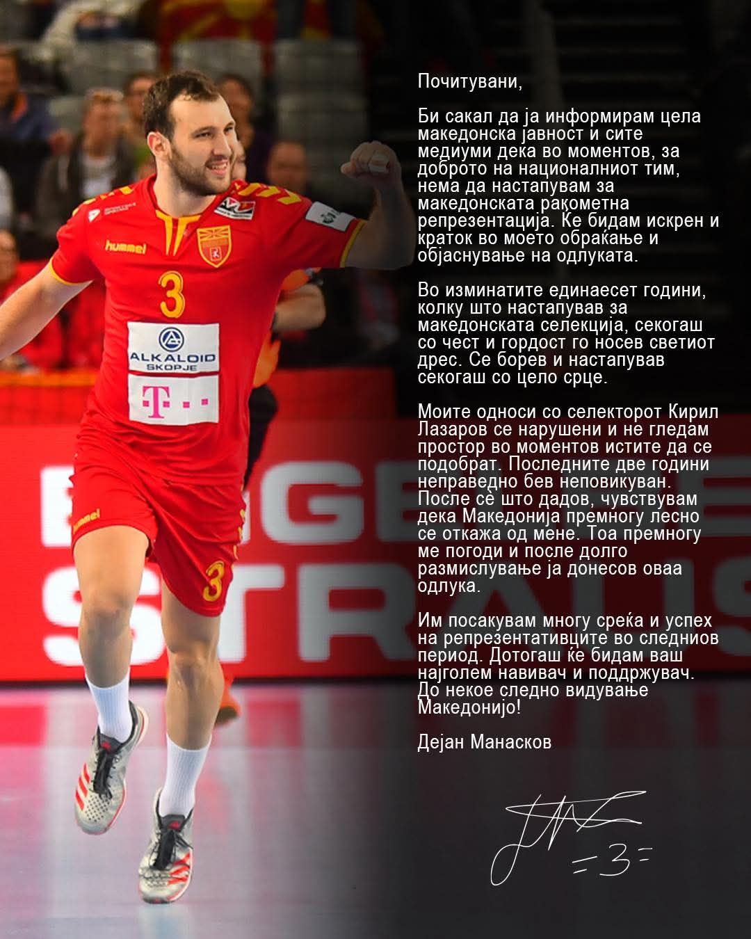 „Почитувани, Би сакал да ја информирам цела македонска јавност и сите медиуми дека во моментов, за доброто на националниот тим, нема да настапувам за македонската ракометна репрезентација. Ќе бидам искрен и краток во моето обраќање и објаснување на одлуката. Во изминатите единаесет години, колку што настапував за македонската селекција, секогаш со чест и гордост го носев светиот дрес.
