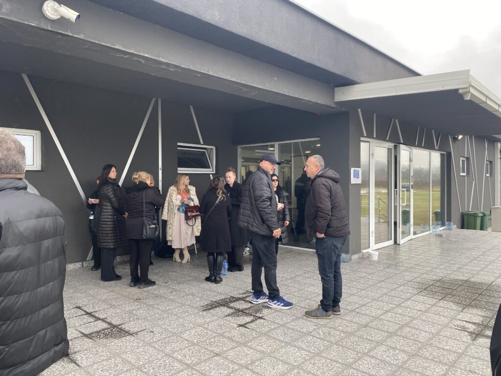 Родителите и повредените чекаат да влезат во делот од судницта од каде преку стаклени врати го следат судењето.