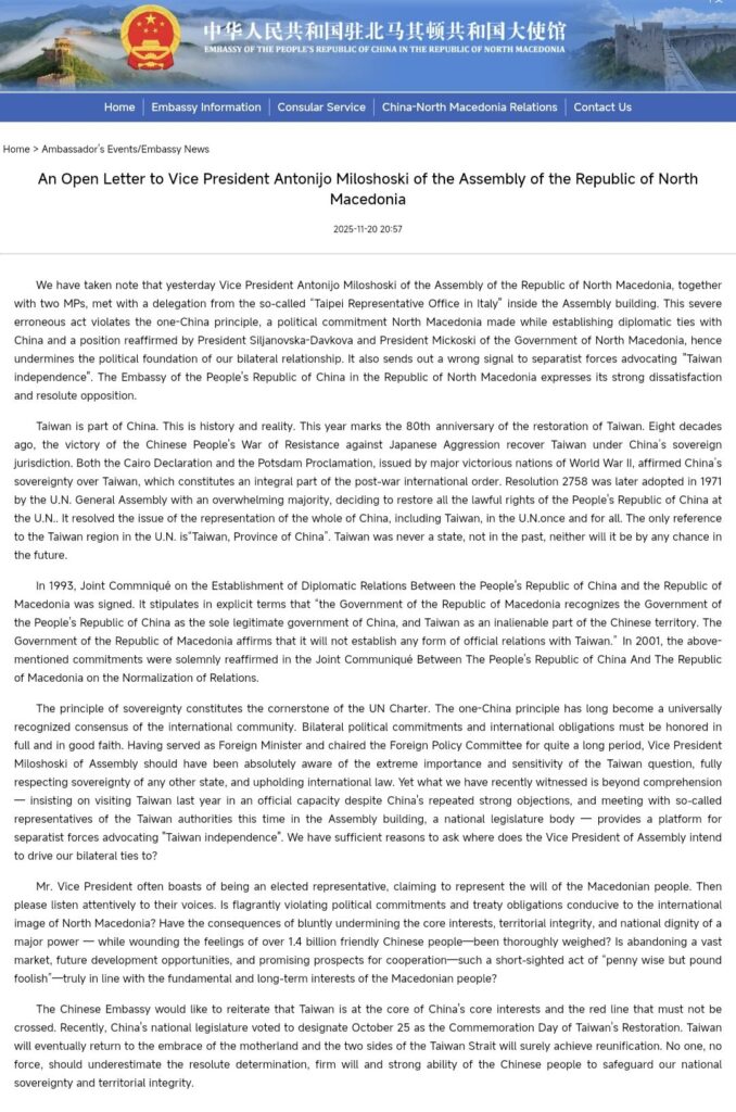 Во острата реакција за средбата со, како што велат, „таканареченото ‘Претставништво на Тајпеј во Италија’ во зградата на Собранието“, преку отворено писмо до Милошоски, кинеската амбасада во Македонија вчера предупреди дека „овој тежок погрешен чин го крши принципот ‘Една Кина’“, политичка обврска што Македонија ја презеде при воспоставувањето дипломатски односи со Кина“ и „испраќа погрешен сигнал до сепаратистичките сили кои се залагаат за ‘независност на Тајван’“. Кинеската амбасада потенцира дека „прашањето за Тајван е јадрото на фундаменталните интереси на Кина и претставува црвена линија што не може да се премине“.