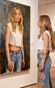 За фотографијата на која е прикажана таа и нејзиниот портрет изработен со вештачка интелигенција, Олимпија ќе каже: „Како да ја гледам сопствената еволуција во реално време. Моето патување никогаш не било линеарно – било неуредно, смело, љубопитно и длабоко лично. Ова дело го доловува сето тоа. Тоа е повеќе од портрет; тоа е потсетник за тоа колку далеку сум стигнала и колку повеќе сум подготвена да создадам.