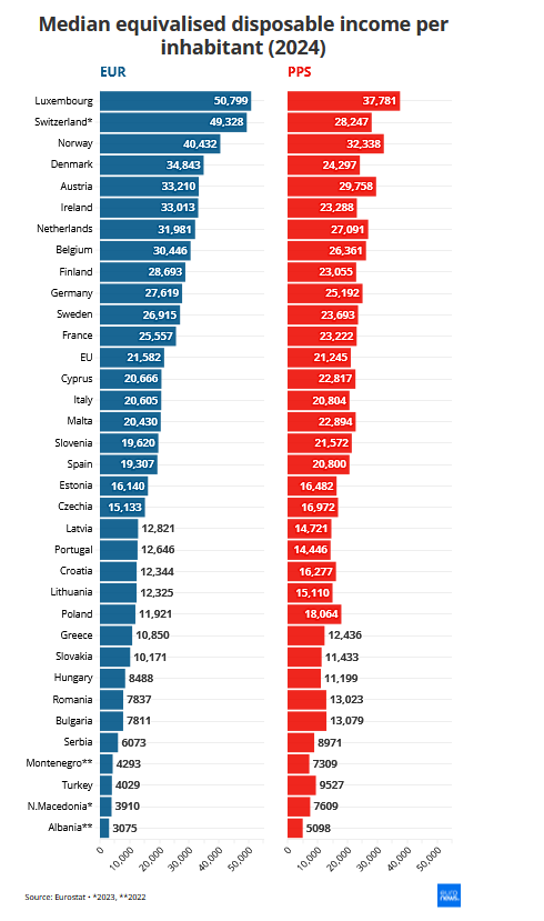 Според податоците за 2024 година, средниот изедначен приход во 34 европски земји се движи од 3.075 евра во Албанија до 50.799 евра во Луксембург.