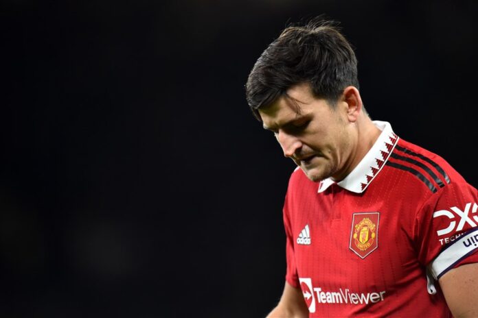 epa10379525 Harry Maguire of Manchester United during the English Premier League soccer match between Manchester United and Nottingham Forest in Manchester, Britain, 27 December 2022. EPA-EFE/Peter Powell EDITORIAL USE ONLY. No use with unauthorized audio, video, data, fixture lists, club/league logos or 'live' services. Online in-match use limited to 120 images, no video emulation. No use in betting, games or single club/league/player publications