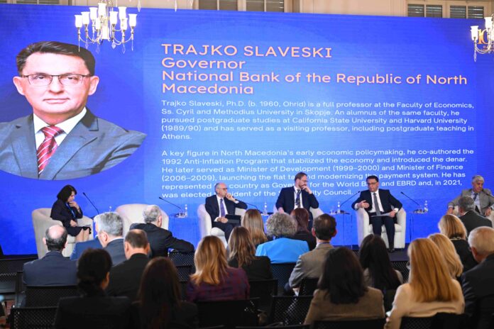 – Народната банка дејствуваше одлучно за да ги зачува макроекономската и финансиската стабилност во економијата. Како и повеќето централни банки во регионот и пошироко, беа преземени сеопфатни пакет-мерки насочени кон стабилизирање на инфлацијата, зачувување на стабилноста на девизниот курс и зајакнување на финансиската стабилност – истакна гувернерот д-р Трајко Славески на конференцијата што се одржа во Тирана, Албанија.