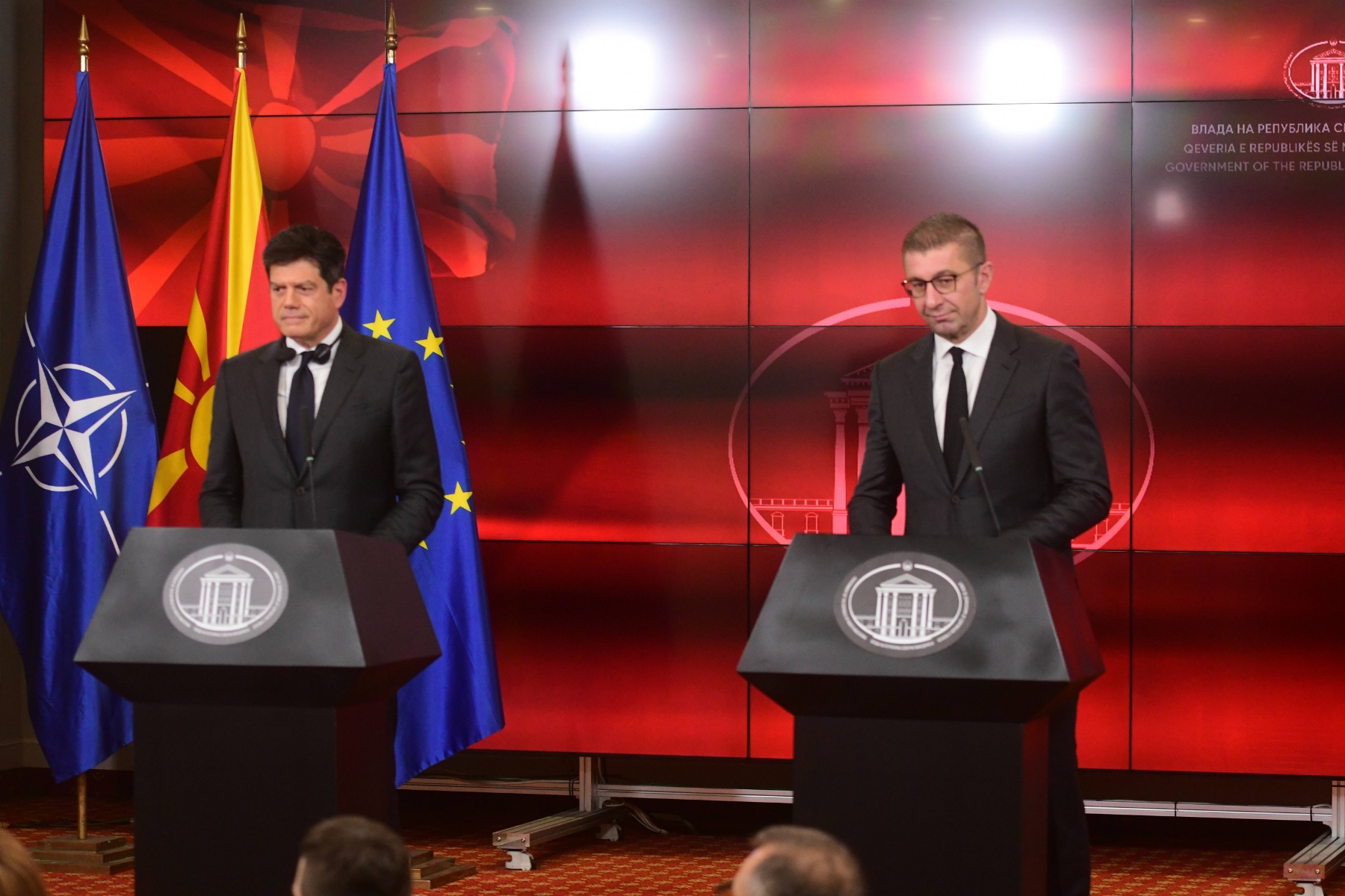Владата останува 100 проценти усогласена со заедничката надворешна и безбедносна политика на Европската Унија, што претставува важна придобивка за карактерот на нашите меѓусебни односи и за нивото на нашата посветеност кон европските вредности. Како Влада остануваме целосно посветени на европскиот пат и на реформите кои ја прават државата посилна, пофункционална и поправедна. Ќе ги адресираме сите области каде е забележан застој со конкретни мерки и отчетност. Нашата цел е полноправно членство во рамки на ЕУ, порача премиерот Христијан Мицкоски на денешната заедничка прес-конференција со ЕУ амбасадорот Михалис Рокас, по примопредавањето на Извештајот за напредокот на земјава.