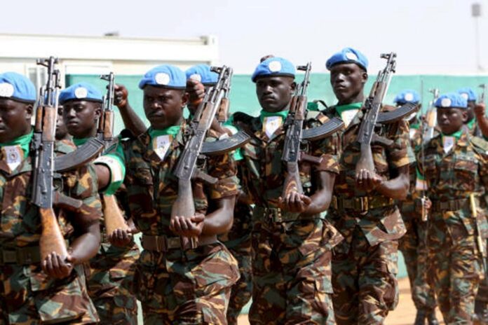 epa01211629 Former African Union troops now under command of the United Nations march after donning their blue berets following a handover ceremony in El Fasher, Sudan 31 December 2007 that transferred the African Union peacekeeping mandate to come under United Nations leadership. The Force which now stands at about 9000 will triple in a few months to reach over 21,000 elements thus constituting the most important UN operation worldwide. A ceremony was organized in El Fashir, capital of |North Darfur on Monday in which the troops changed the beret from the AU green headgears to the Blue helmets. EPA EPA/AFRICAN UNION MISSION best quality available EDITORIAL USE ONLY