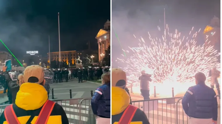Полициски кордон ги раздвојува двете групи граѓани собрани во близина на Народното собрание во Србија. Едната група дојде да ја поддржи Дијана Хрка, мајката на Стефан Хрка, жртва во падот на настрешницата на железничката станица во Нови Сад, додека другата група е пред шаторите поставени во близина на Собранието.