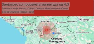 Земјотрес со јачина 4,3 степени според Рихтеровата скала е почувствуван вечерва во Скопје. Земјотресот се удри на 23 километри југоисточно од Призрен, Косово и 12 километри северно од Тетово, Македонија.