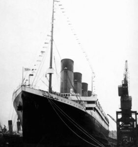 Во текот на првото патување, „Титаник“ удрил во санта мраз во Северниот Атлантик, пред полноќ на 14 април 1912 година и потонал два часа и четириесет минути подоцна, на 15 април. Судирот ја оштетил десната страна на трупот и предизвикал поплавување на првите пет прегради.