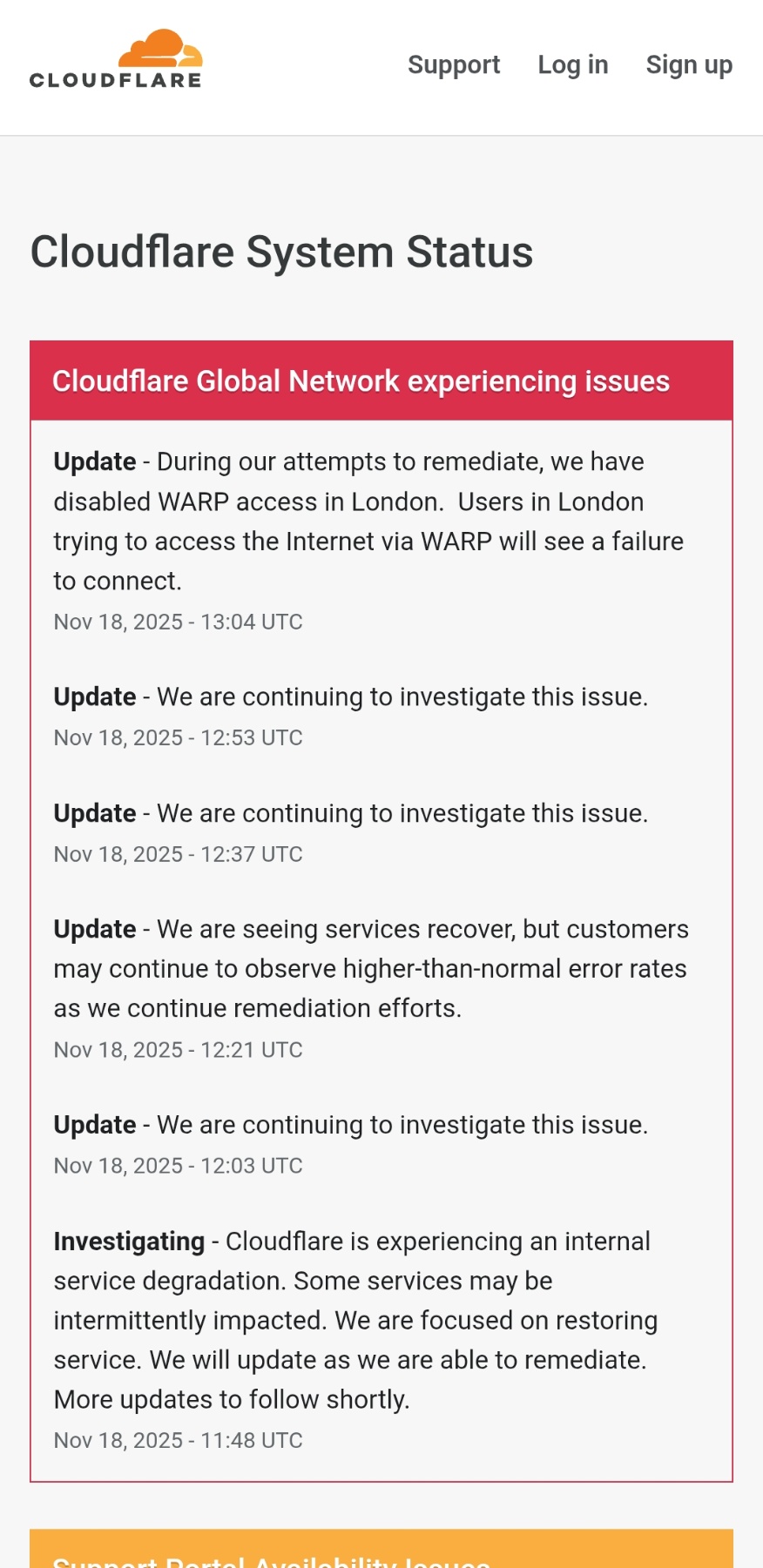 Cloudflare го нарече „внатрешна деградација на услугата“. Потребни беа нешто помалку од три часа од моментот кога компанијата објави дека го истражува проблемот до објавувањето дека е имплементирана поправка и дека инцидентот е решен во 14:42 часот по британско време. Можеби имало посебен проблем со услугите во Лондон, бидејќи Cloudflare рече дека морал да ја исклучи својата услуга за енкрипција во британскиот главен град додека се обидувал да се опорави. Компанијата, исто така, соопшти дека имало необичен скок во сообраќајот кон една од нејзините услуги околу 11:20 часот наутро, но причината сè уште не е позната.