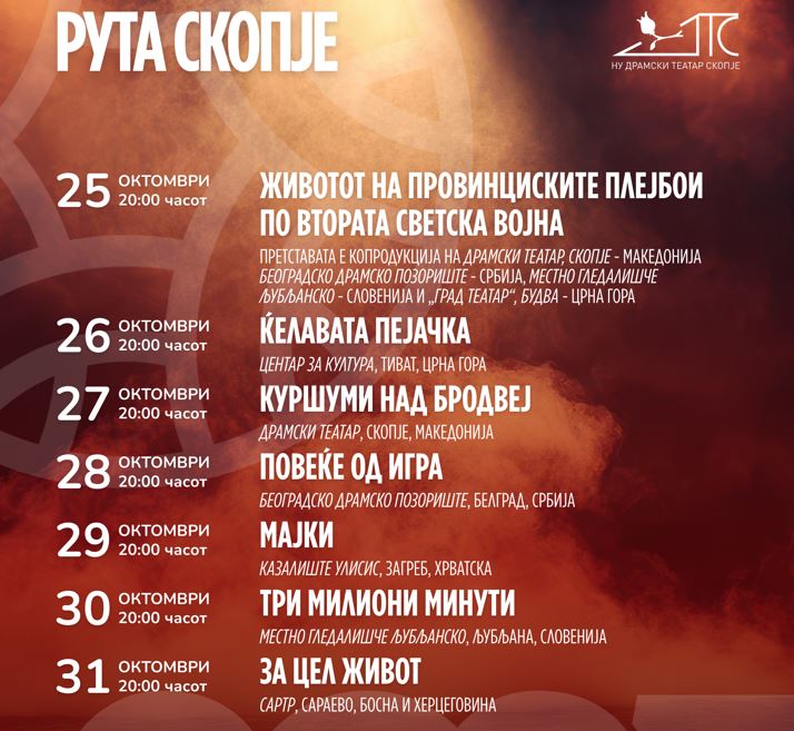 Во рамки на РУТА до 31 октомври на сцената на Драмски, од 20 часот ќе се изведат уште шест претстави.