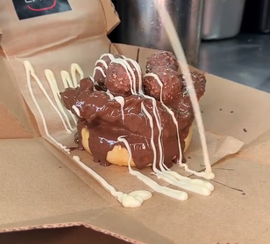 „Првиот чоколаден бургер во Олдам. Пржено пилешко со чоколадо и топчиња од Фереро Роше. Кој е доволно храбар?“, напишаа тие.