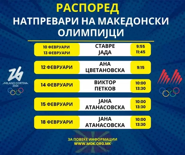Познат точниот распоред на настапи на македонските олимпијци на ЗОИ 2026 година во Милано и Кортина, кој е потврден и од Македонскиот олимписки комитет (МОК).