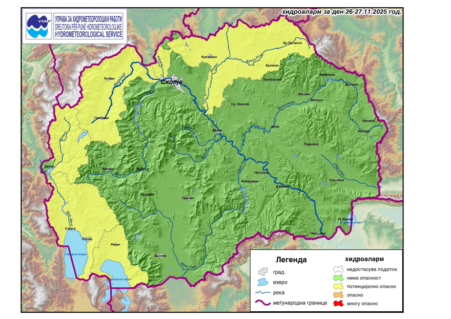 Управата за хидрометеоролошки работи (УХМР) денеска повторно издаде жолто ниво на предупредување од поплави. Предупредувањето е издадено поради постоење на потенцијална опасност од излевање на реките.