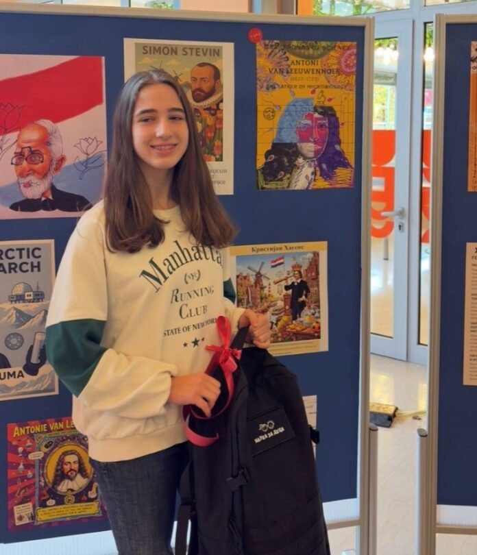 На неодамнешниот натпревар ,„Холандска наука”, кој го организираше Амбасадата на Холандија, деветтоодделенката Каја Трпкоски, од ООУ „Лазо Трповски“, во општина Карпош, заслужено го освои првото место.