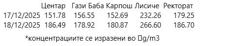 Министерството за животна средина и просторно планирање информира дека според податоците од Државниот автоматски мониторинг систем за квалитет на амбиенталниот воздух и добиената временска прогноза од Управата за хидрометеоролошки работи, прагот на алармирање на суспендирани честички со големина до 10 микрометри (надминување на вредноста од 150 mg /m3 во текот на два последователни денови) е надминат на мерните места во Скопје – Центар, Гази Баба, Карпош, Лисиче и Ректорат.