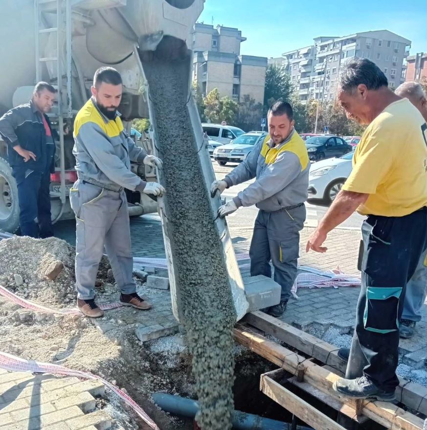 Екипите на ЈП „Улици и патишта” вршат бетонирање на темелите за поставување семафорски столбови на крстосницата на улицата „Васко Карангелески“ со улицата „Ангел Димовски“.