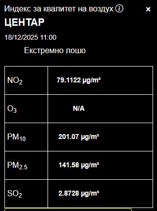 Екстремна загаденост бележи и новиот портал на Министерството за животна средина и просторно планирање. Во моментов мерната станица Центар во Скопје покажува дека концентрацијата на ПМ10 честички изнесува 201,07 μг/м3 што е четири пати повеќе од дозволените 50 μг/м3, додека концентрациите во воздухот на ПМ2,5 честички изнесува 141,58 μг/м3, а се смета дека 24-часовната концентрација на ПМ2.5 се оценува за нездрава кога се зголемува над 35,4 μг/м3.