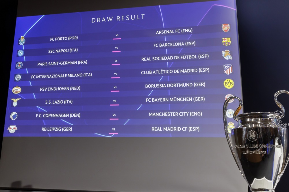 epa11035679 The draw results are shown on an electronic panel next to the UEFA Champions League trophy, after the draw ceremony for the UEFA Champions League Round of 16 fixtures in Nyon, Switzerland, 18 December 2023. EPA-EFE/SALVATORE DI NOLFI